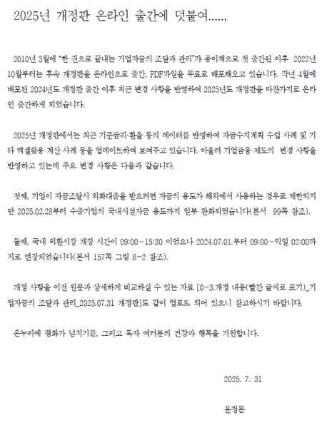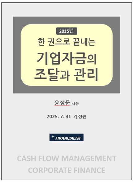 이후 최근까지의 변경사항 등을 반영하여 『[2025년] 한 권으로 끝내는 기업자금의 조달과 관리』를 2025.07.31자로 온라인 출간하며 관련 파일을 다음과 같이 첨부하였으니 다운로드 받으세요^^