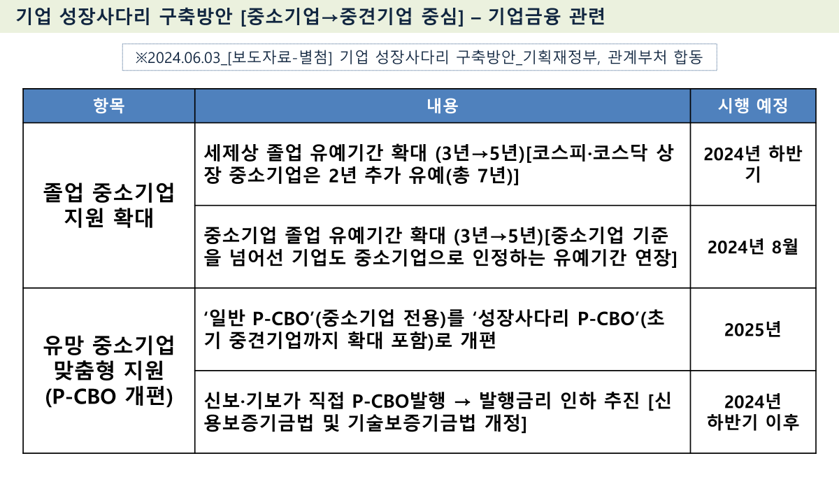 기획재정부 등에서 지난 2024.06.03자 보도자료를 통해 "기업 성장사다리 구축방안"을 발표하였습니다.