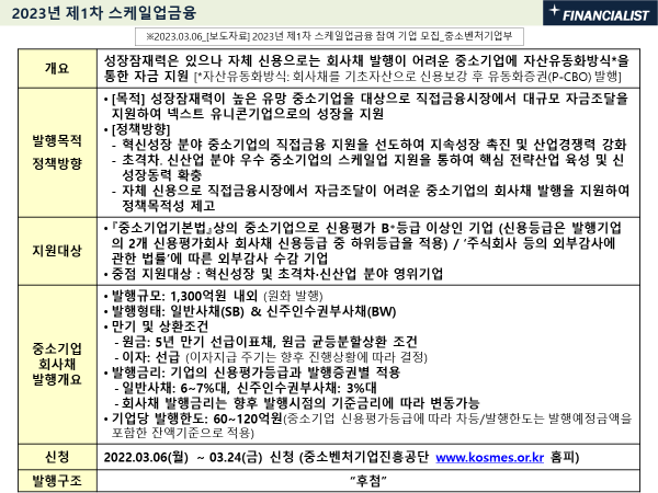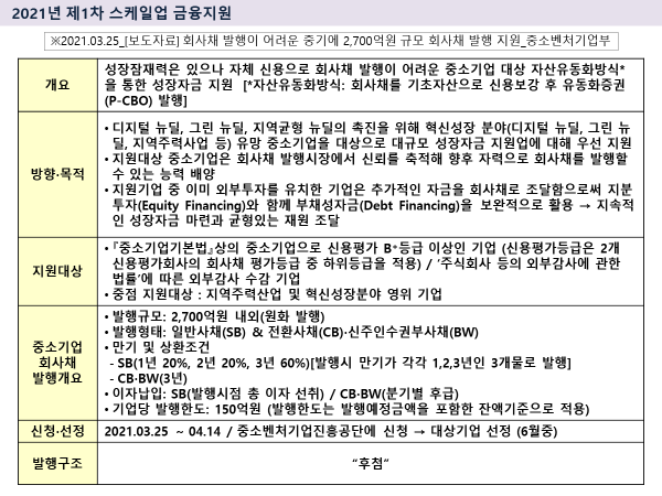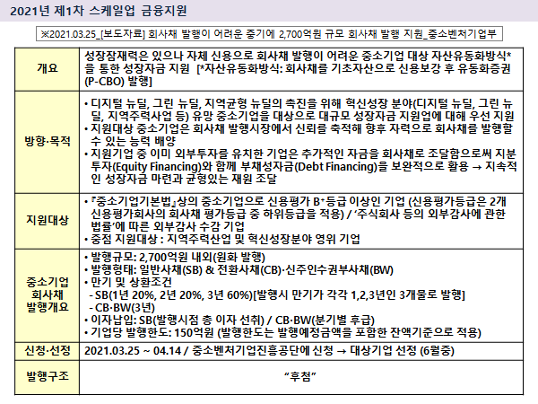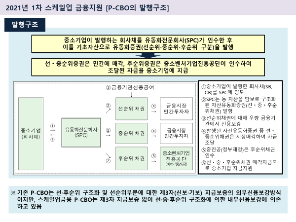 - 아울러 중소기업이 신용보증기금·기술보증기금의 보증 혜택을 받아 회사채를 발행할 수 있도록 하는 P-CBO(Primary-Collateralized Bond Obligation, 발행시장-채권담보부증권) 제도를 개편하여 중견기업까지 포함하도록 할 예정 [2025년 시행 예정]