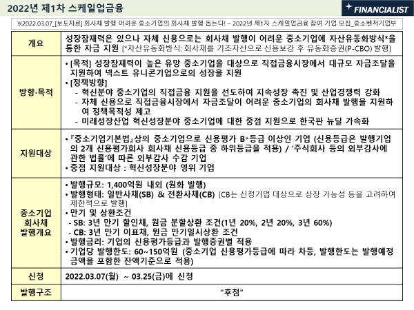 - 중소기업들이 사전에 신보 기보와 사전 협의하여 회사채(사모 방식) 발행